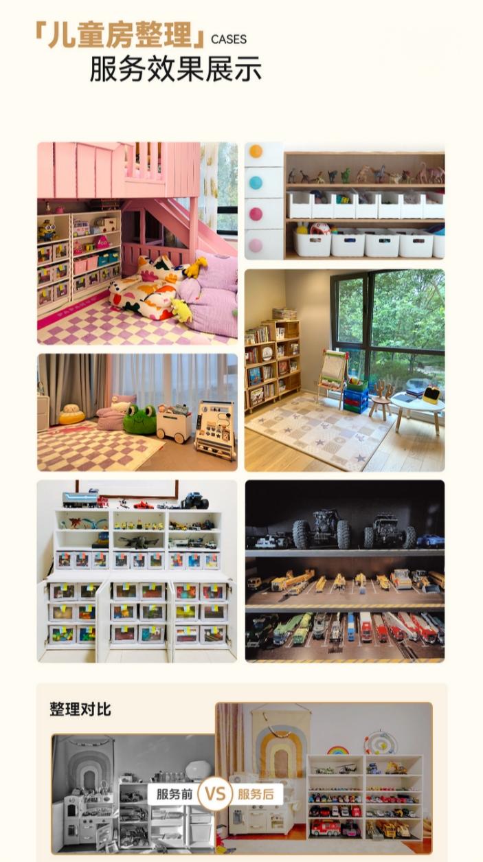 - 管理技巧教学:服务完成后,整理师开展实用的儿童房维护技巧教学,助力客户学会保持儿童房长期整洁,确保整理效果持久,还会根据孩子成长提供售后咨询。