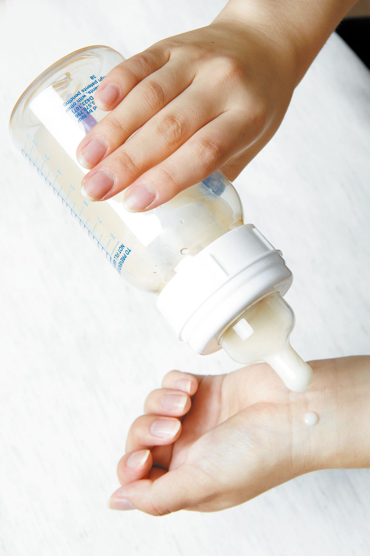 检查温度:将一点奶液滴在手腕内侧,感觉其温度是否适宜。如果太热或太冷,可以适当调整。